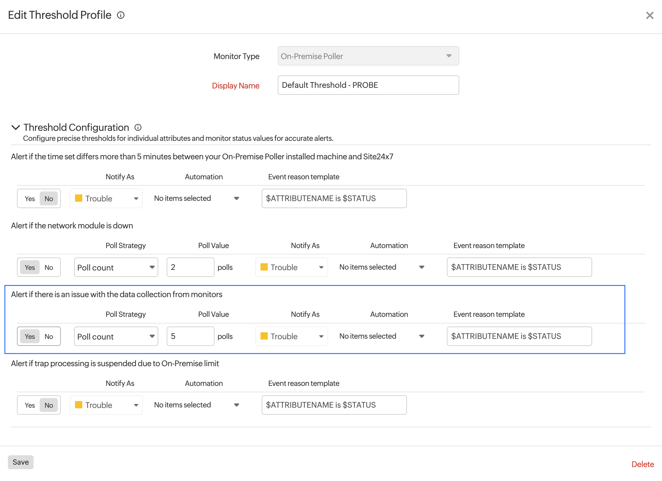 To make these issues easier to track, we recommend configuring a threshold profile using the Alert if there is an issue with the data collection from monitors attribute in the On-Premise Poller's Threshold and Availability Profile. This will help you receive alerts whenever the On-Premise Poller encounters data collection problems.